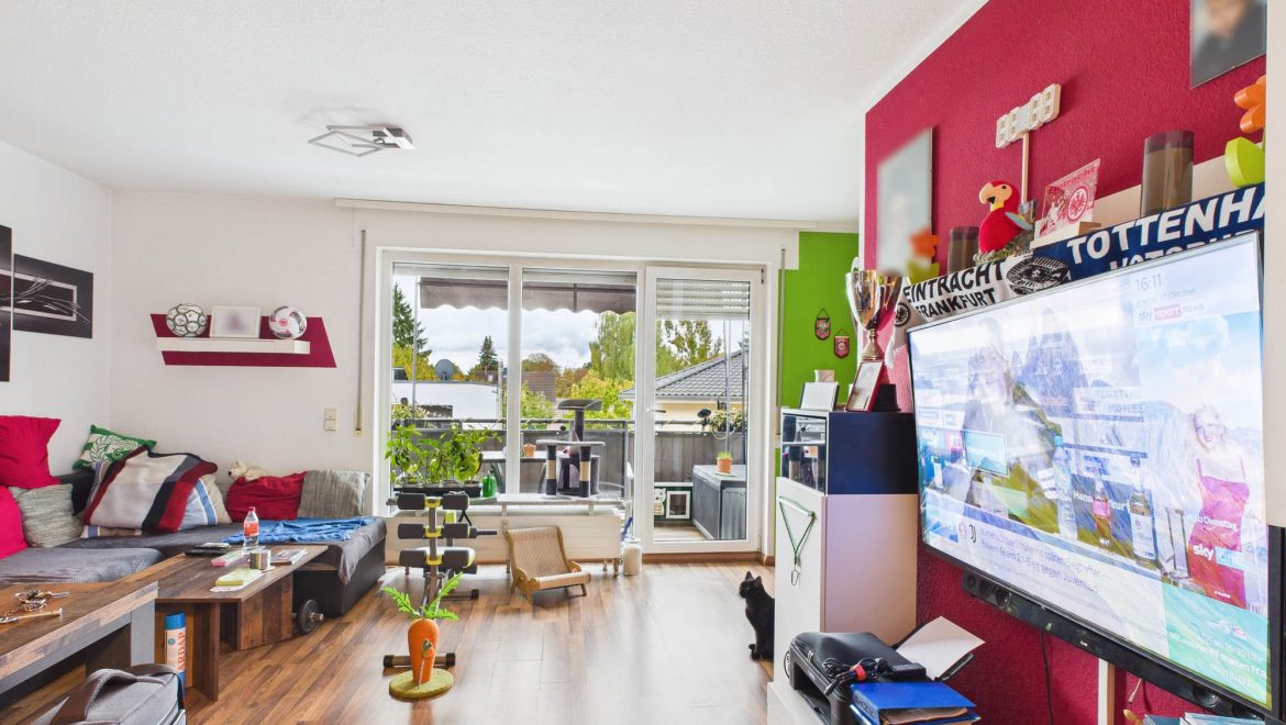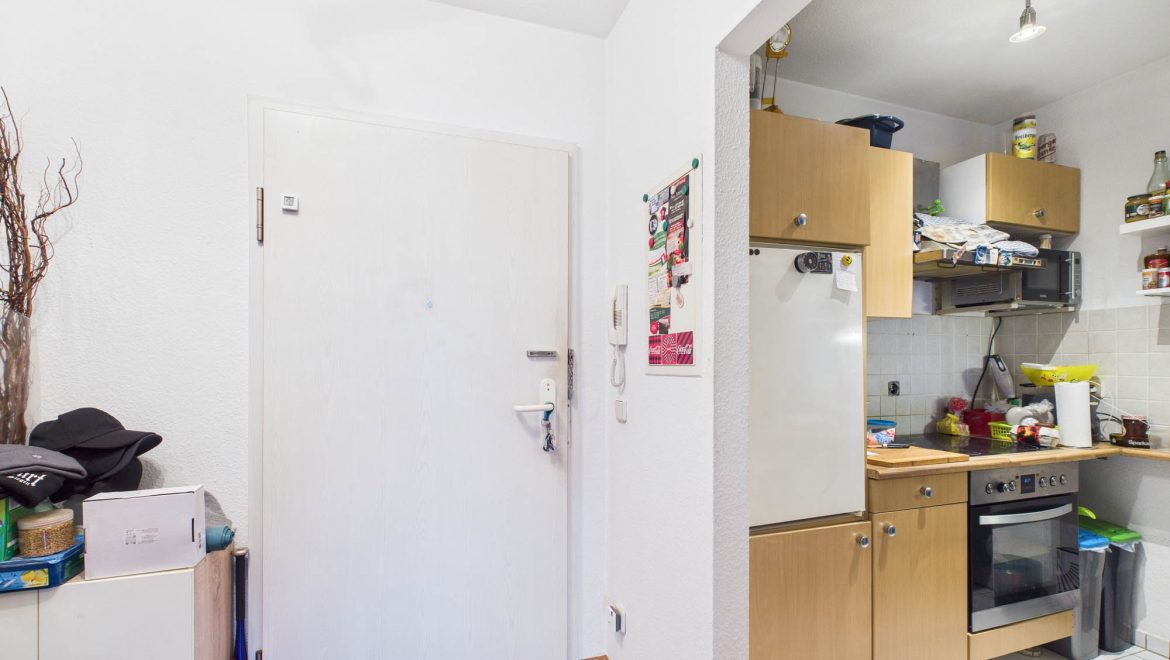 Die Wohnung selbst bietet einen durchdachten Grundriss: Der helle Wohnbereich mit Zugang zum sonnigen Süd-Balkon ermöglicht einen schönen Blick in die ruhige Wohnsiedlung. Die angrenzende Küche verfügt über eine praktische Durchreiche zum Wohnzimmer und ist mit allen notwendigen Anschlüssen ausgestattet. Das Bad ist mit einer Dusche und einem Waschmaschinenanschluss versehen.