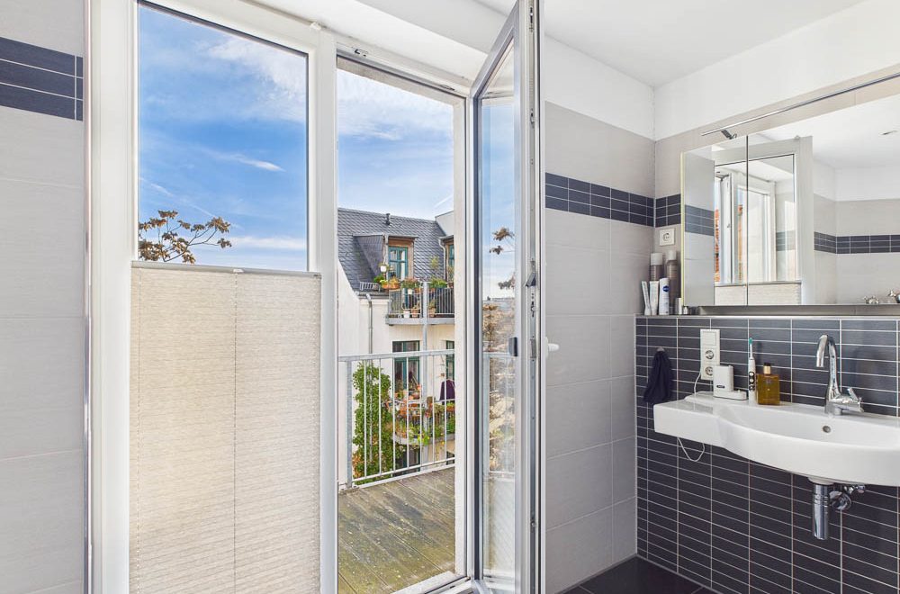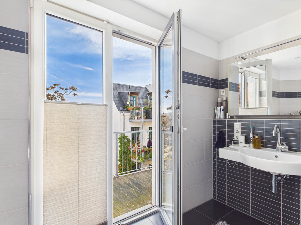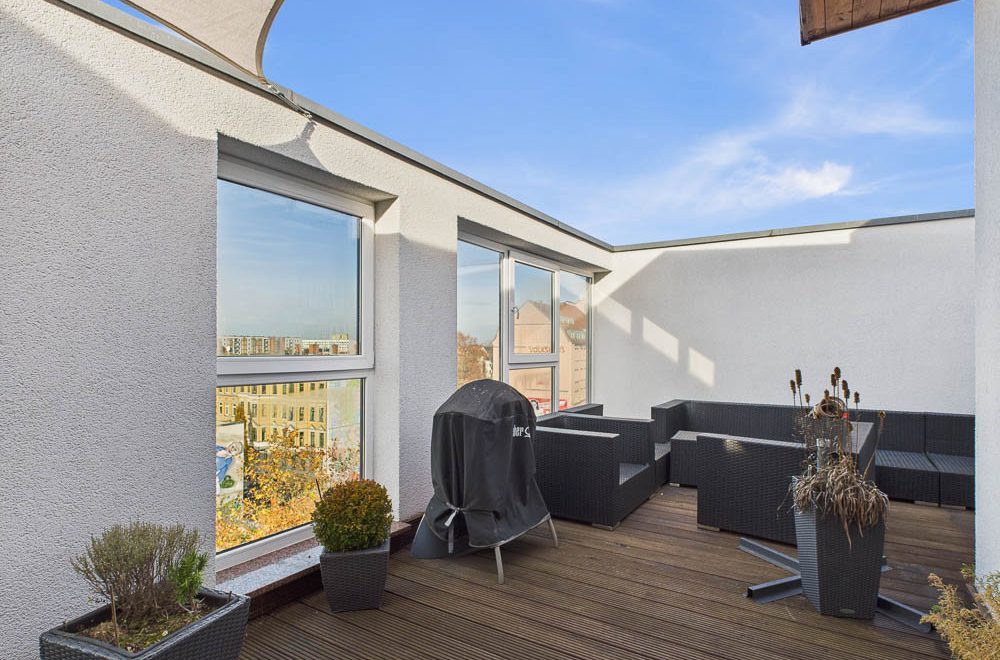 Die obere Ebene bildet das Herzstück der Wohnung: ein weitläufiger Wohn- und Essbereich mit offener Designerküche von Marquardt, ausgestattet mit hochwertigen Quarz-Arbeitsflächen, Induktionsherd, Dampfgarer und Warmhaltefach. Großzügige Fensterfronten sorgen für ein helles, offenes Ambiente und einen fließenden Übergang zur beeindruckenden Dachterrasse mit rund 30 m² Fläche. Ein Ort, der zum Entspannen oder zum geselligen Beisammensein über den Dächern der Südvorstadt einlädt und einen tollen Blick über Leipzig garantiert. Ergänzt wird die obere Etage durch ein weiteres Bad mit Sauna und Fenster, das Wellness und Ausblick vereint, sowie einen praktischen Abstellraum. Dieses wurde 2021 letztmalig saniert.
