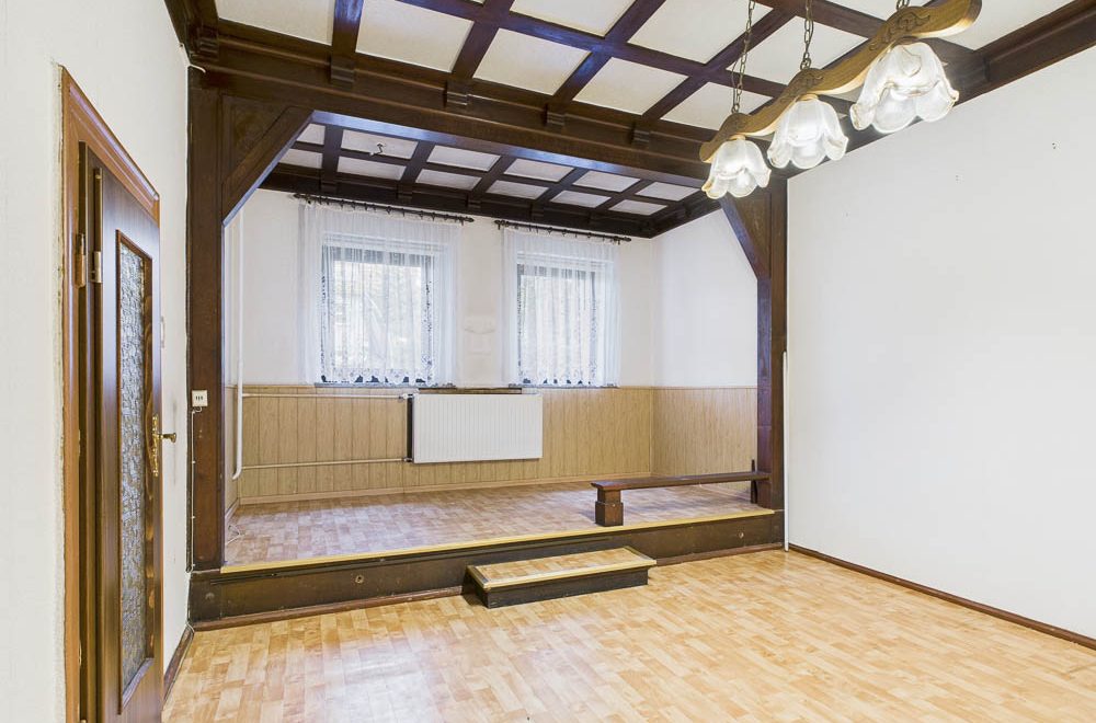 Das Haus erstreckt sich über drei Ebenen und umfasst insgesamt sieben Zimmer. Schon beim Eintreten wird der besondere Charme der Immobilie spürbar: Charaktervolle Decken, allen voran die eindrucksvolle Wohnzimmerdecke, sowie die massiven 36er Außenwände verleihen dem Zuhause eine Wohnqualität, wie man sie heute nur noch selten findet.