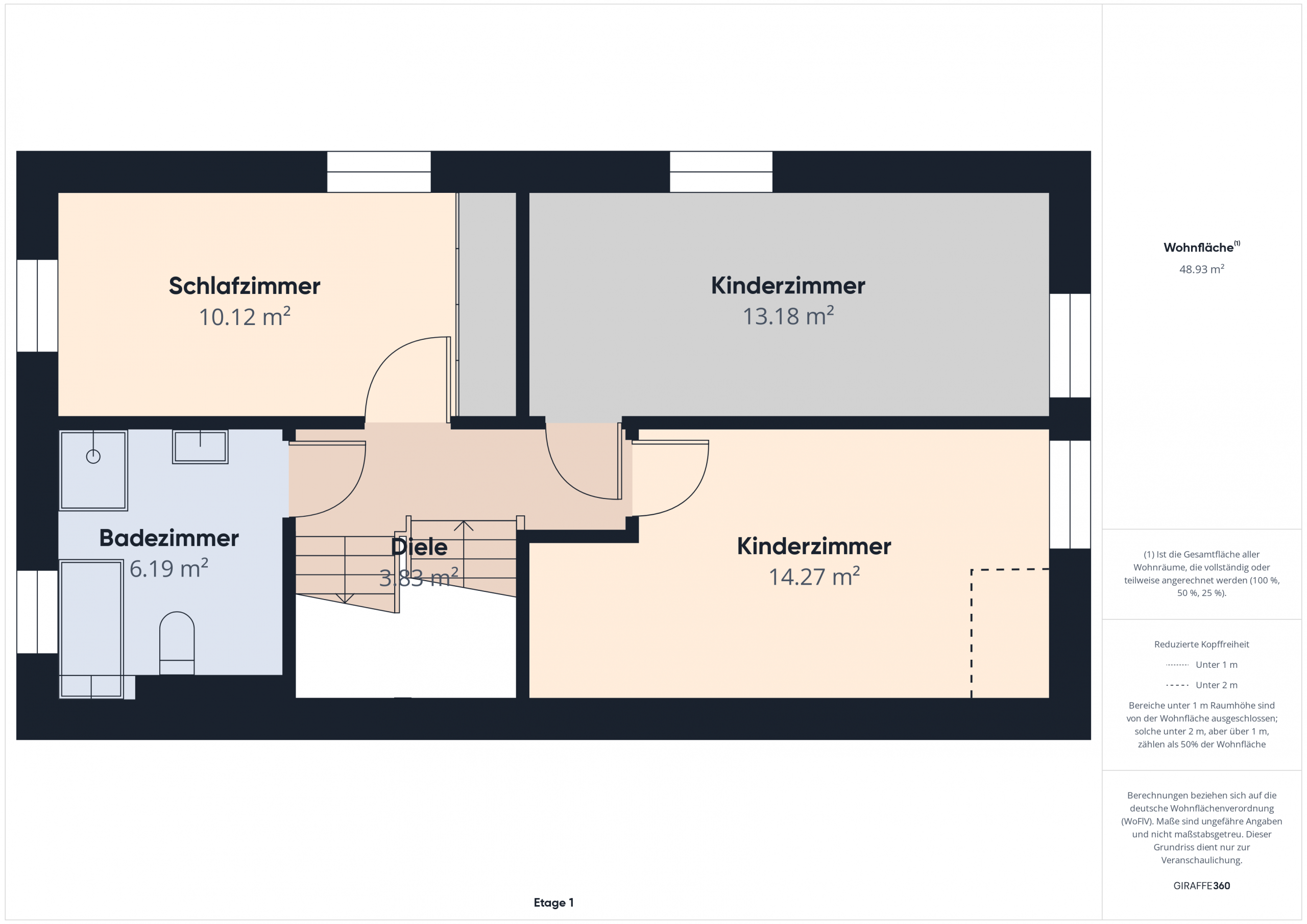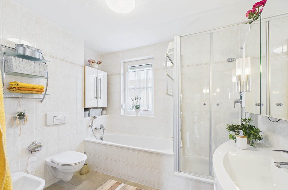 Im 1. Obergeschoss befinden sich drei Zimmer, die sich wunderbar als Kinderzimmer, Schlafzimmer, Gästezimmer oder Homeoffice nutzen lassen. Ebenso liegt hier das erste Badezimmer mit Tageslicht sowie Dusche und Wanne, das durch die neuen Feinsteinfliesen einen modernen Eindruck hinterlässt.
