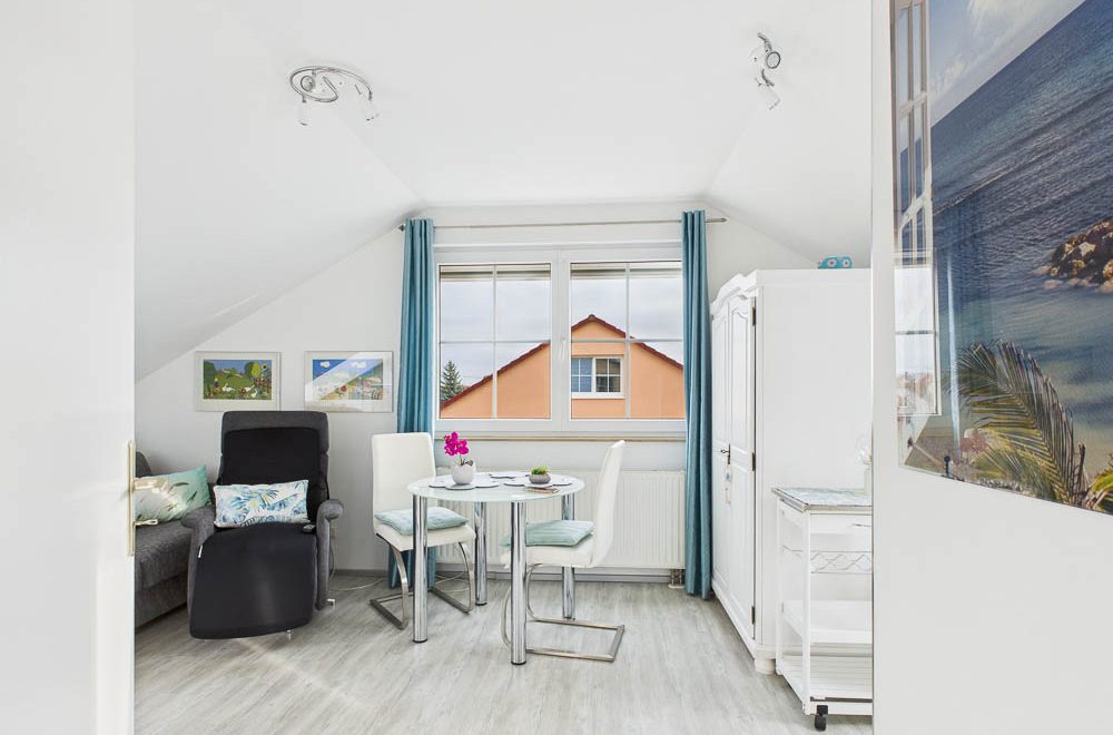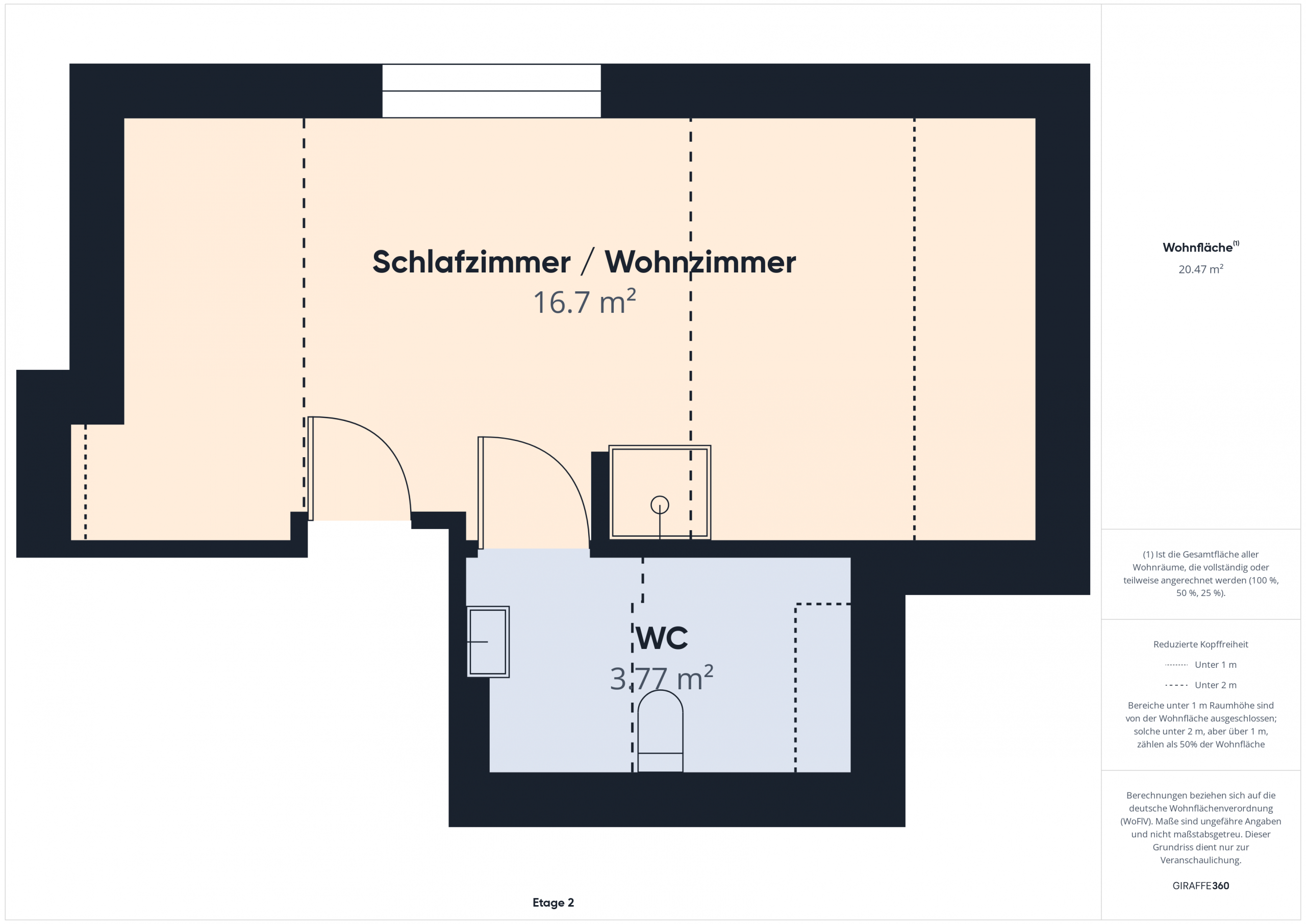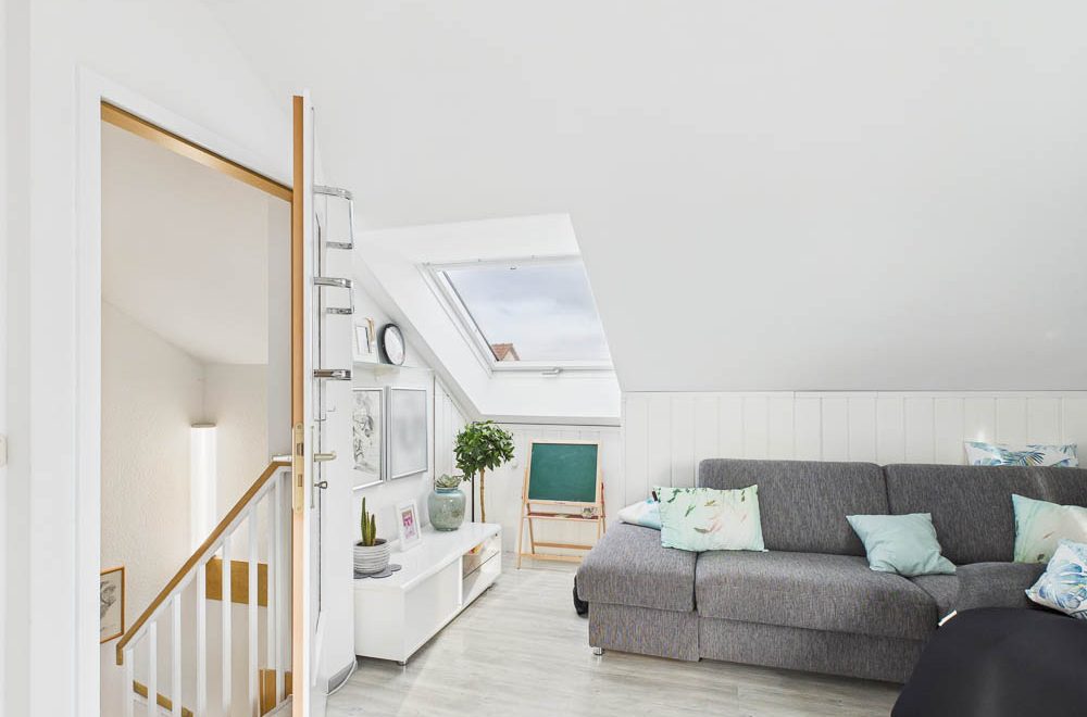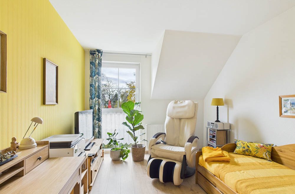 Im Dachgeschoss befindet sich schließlich ein weiteres, sehr gemütliches Zimmer, das mit seiner ruhigen Lage unter dem Dach ein idealer Rückzugsort ist. Perfekt also für größere Kinder, Gäste oder als Arbeitsbereich. Ein zweites Bad mit Dusche auf dieser Ebene bietet dabei ein besonderes Maß an Komfort und Privatsphäre. Ebenfalls ist hier die Heizung sowie die Waschmaschine zu finden.
