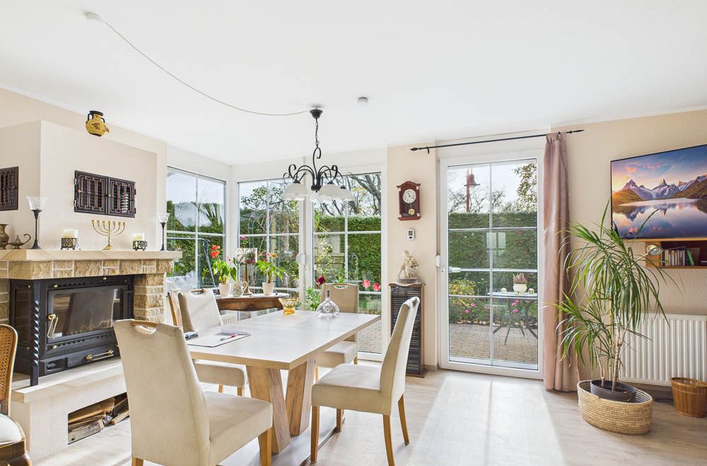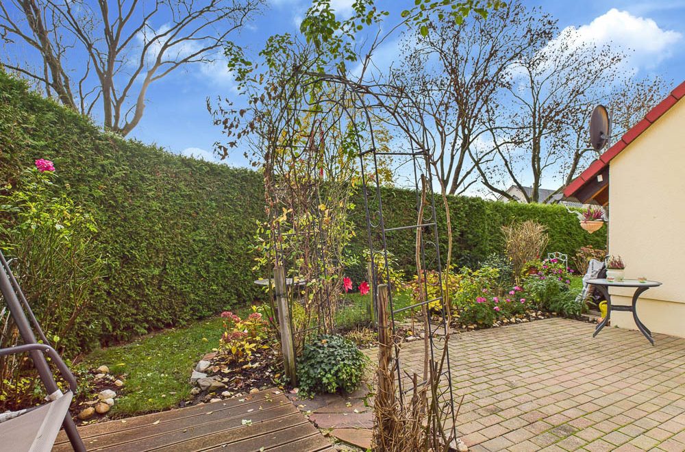 Im Erdgeschoss öffnet sich der helle Wohn- und Essbereich, der durch seine gemütliche Atmosphäre und den Kamin sofort ein Wohlgefühl vermittelt. Die große Fensterfront lässt viel Licht in den Raum und führt direkt auf den Außenbereich. Die Küche schließt sich harmonisch an und wirkt mit ihrer hochwertigen Ausstattung und dem klaren Design modern und einladend. Ergänzt wird das Erdgeschoss durch ein Gäste-WC sowie einen Abstellraum. Über das Wohnzimmer gelangt man in den idyllischen kleinen Garten, der mit einer hohen Hecke umgeben ist und somit für viel Privatsphäre sorgt.
