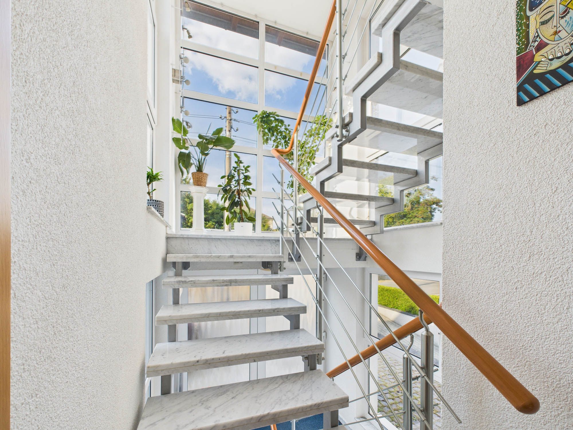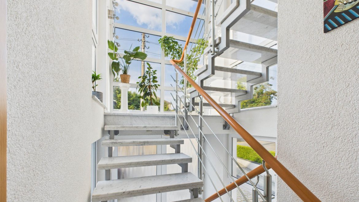 Zur weiteren Ausstattung zählen eine hochwertige Marmortreppe, Fliegengitter an den meisten Fenstern, sowie Außenjalousien (teilweise elektrisch) für alle Fenster. Der Bodenbelag im Obergeschoss besteht überwiegend aus Teppich, ein Raum ist mit Laminat ausgestattet.