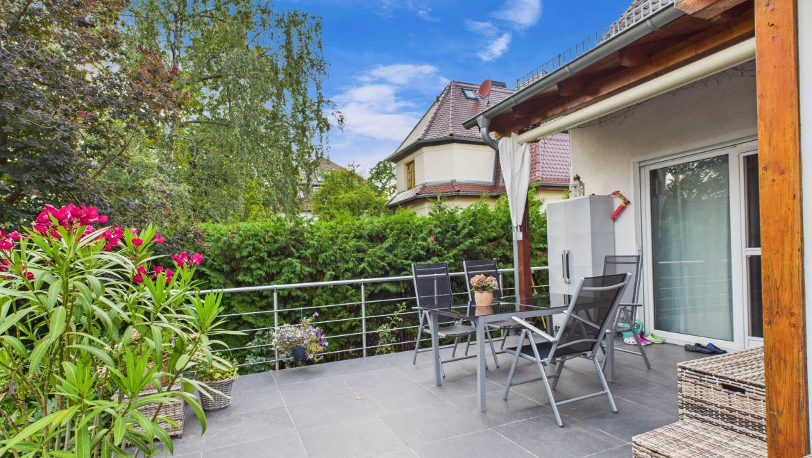 Terrasse mit elektrischer Markise laden zum Entspannen, Grillen und Verweilen ein.